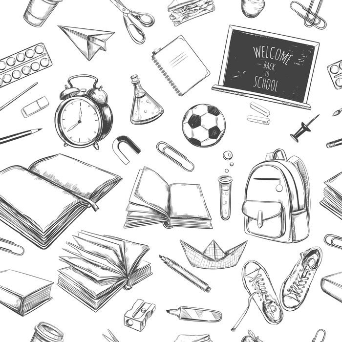Witamy z powrotem do szkoły wektor wzór. ręcznie rysowane elementy. przybory szkolne. książki, notatnik, zeszyt, plecak, lampa, budzik, piłka nożna, trampki, tablica, ołówek, marker, gumka
